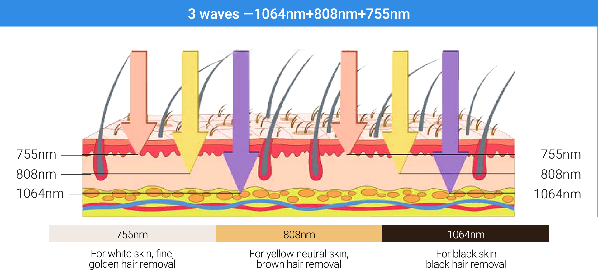 4. 3 Waves 808+755+1064nm for Fast, Safe, Hair Removal on all 6 Skin Types.